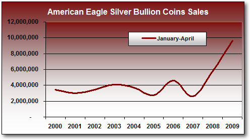 Sales of 2009 Silver Eagle Bullion Coins are blistering hot, with an incredible record-breaking pace of 9.67 million sold through April, according to the latest US Mint sales stats.